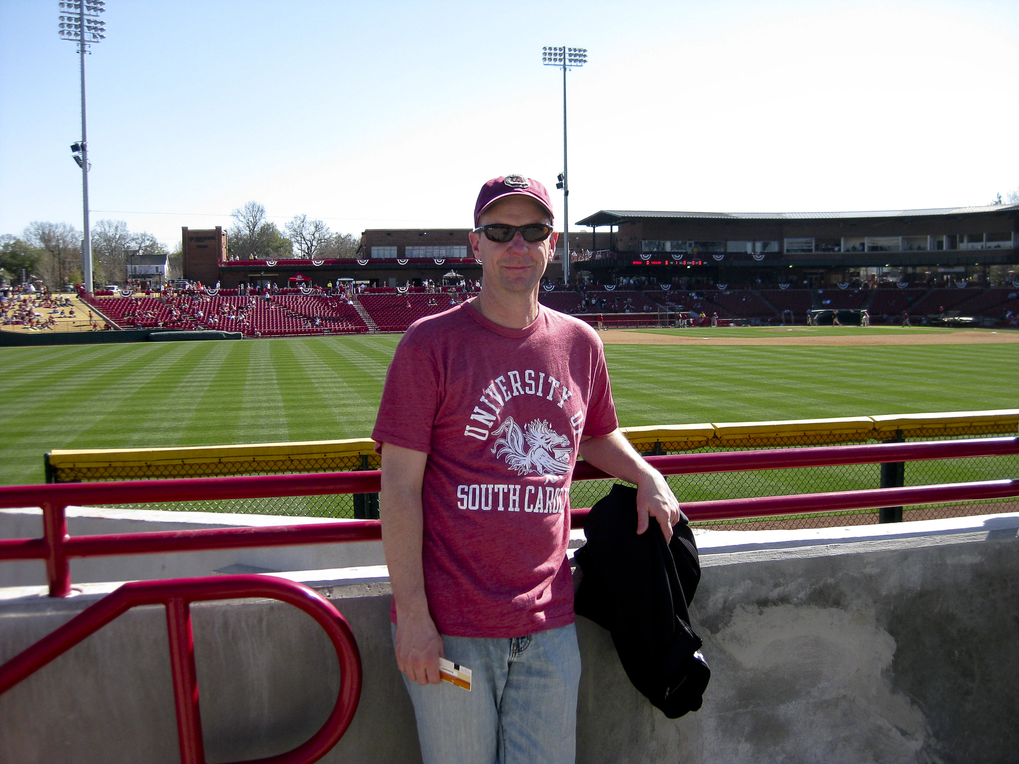 For lunch we dined at Yesterdays, a place Paul remembered for its outstanding nachos.  You really can’t miss Yesterdays, just look for the big cowboy in the bathtub.  Yes, you read that right.  The nachos were not as great as Paul remembered, but when you are in college, you think anything outside the dining hall is 5 star dining.  In addition to the nachos, Paul had a burger and I had a meatloaf sandwich with a side of collard greens.  By the way, I LOVE collard greens, but I knew that before this trip.  After stuffing ourselves beyond capacity, we headed to the USC baseball game at their new stadium.