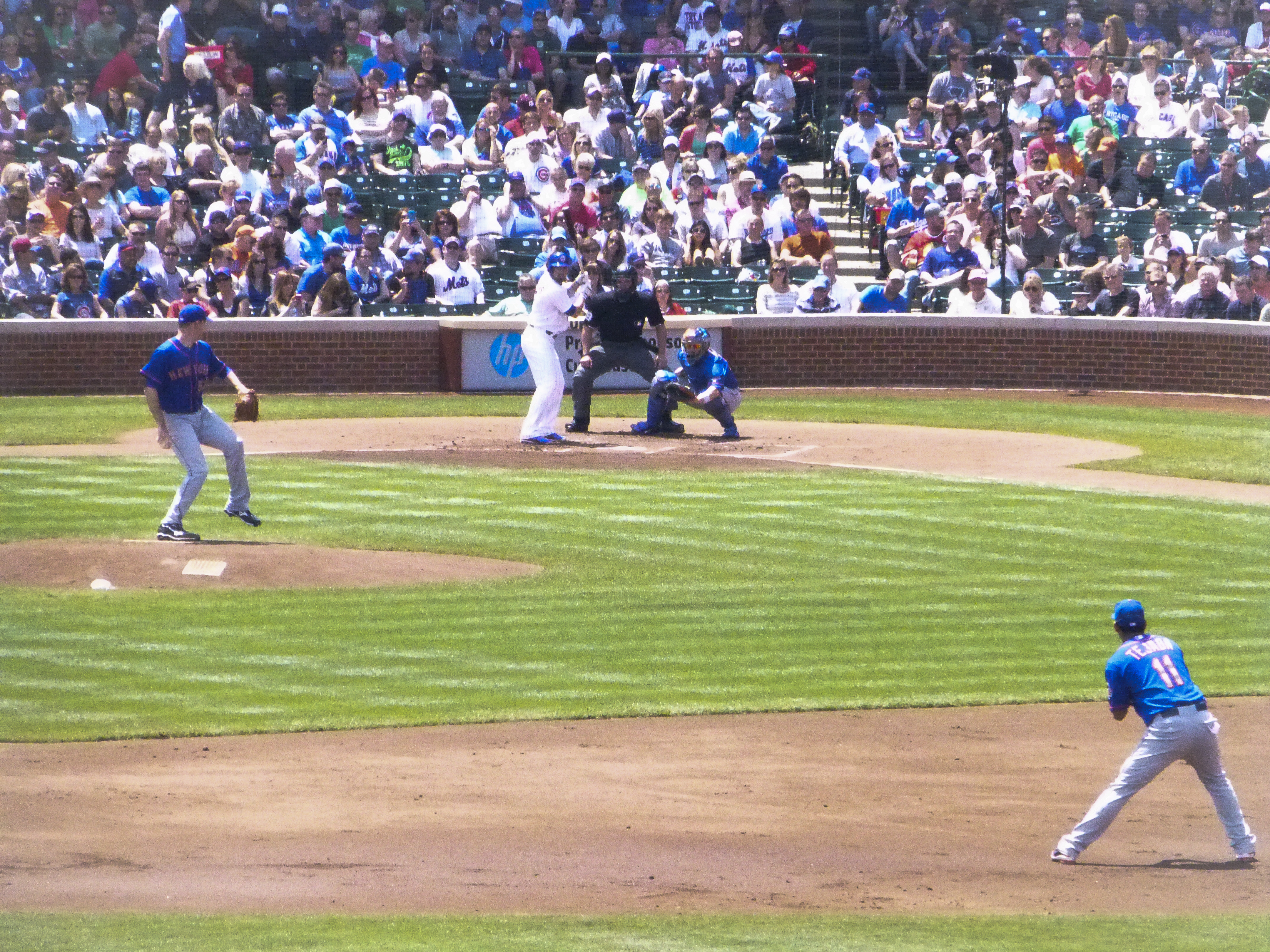 The next morning we navigated the Red Line and headed to Wrigley early to get in line with 500 of our friends in orange shirts to claim our spots in the bleachers. The enthusiasm among us was contagious and the Wrigley employees were, for the most part, extremely friendly and accommodating to this Mets invasion. Once we were seated in the center field bleachers, the Mets players began to notice and run by and wave. Even the general manager, Terry Collins, came out to say hello. It was hard not to feel like we were part of something big. And when we saw the photos in the Daily News the next day, we knew we were, indeed, part of something huge. Darren Meenan brought “a sea of orange” on the road and made Mets history at Wrigley.
