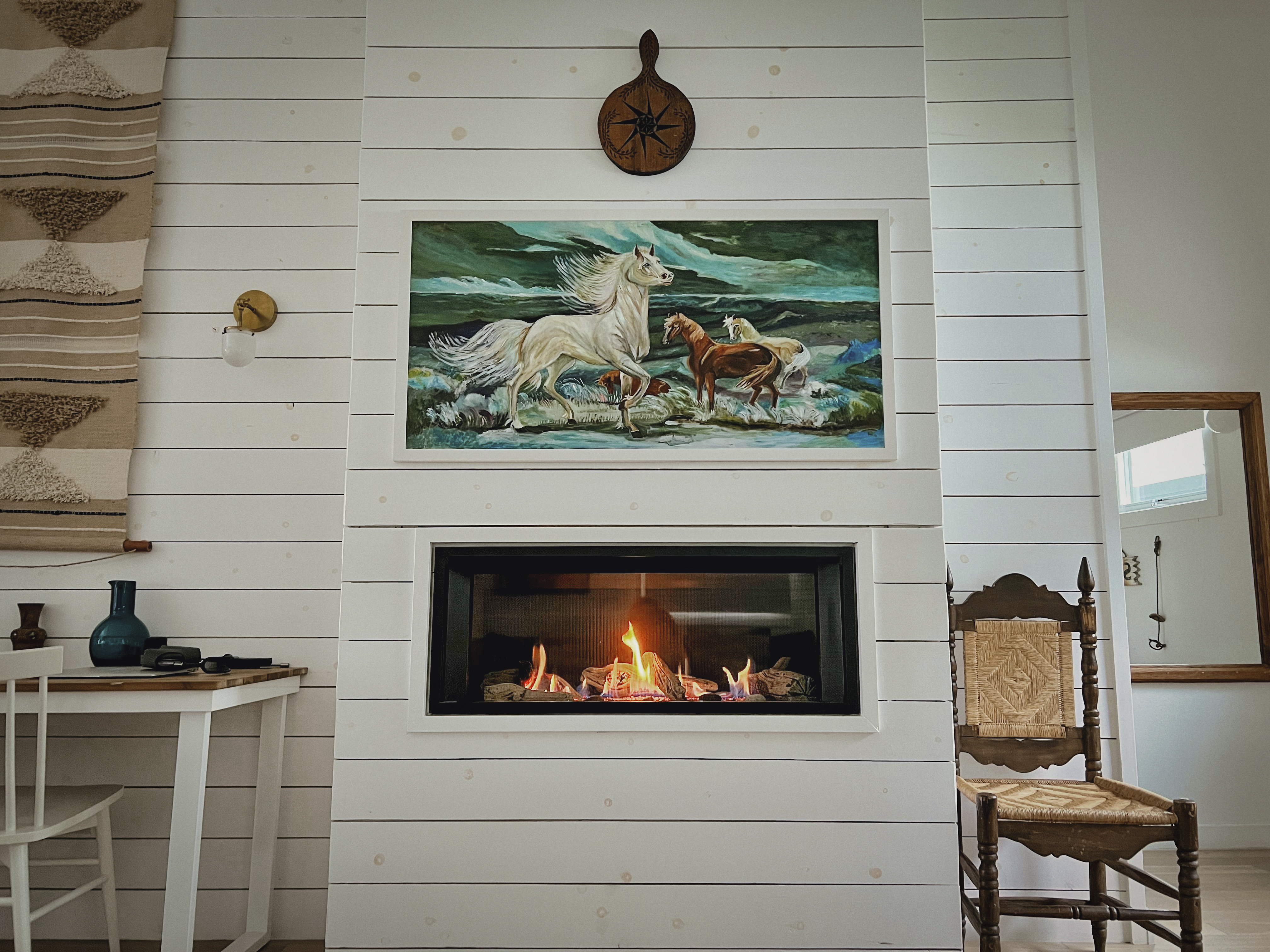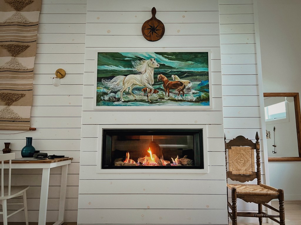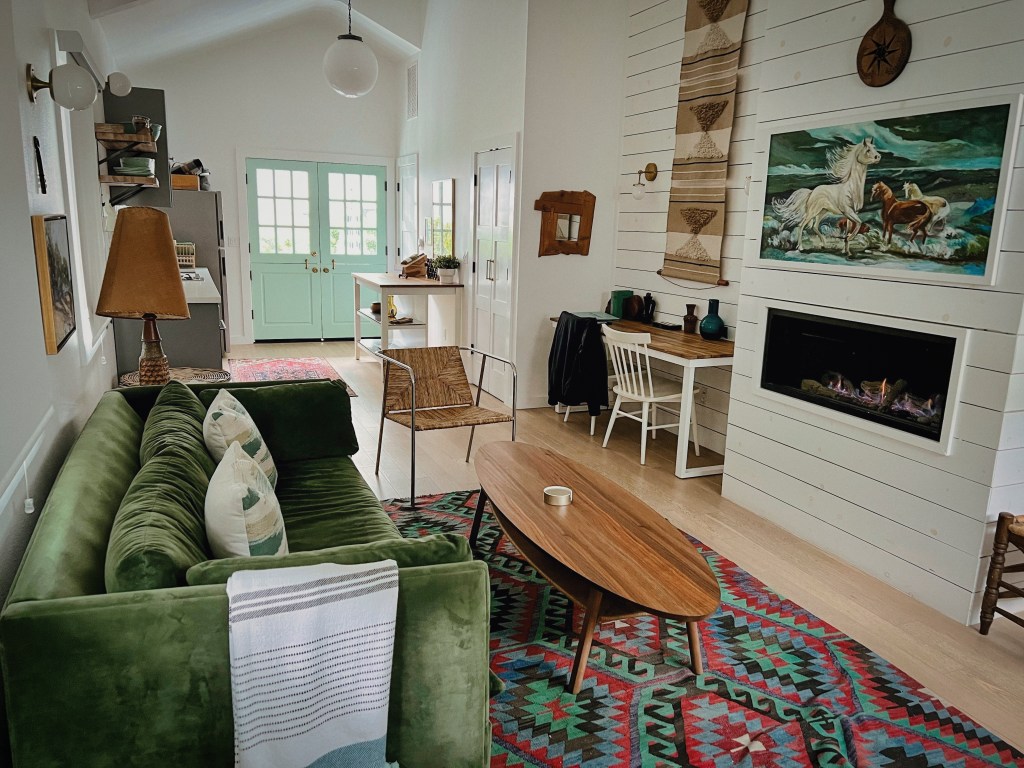 This gorgeous fireplace kept us warm while sipping on local wine and trying to figure out how to build our own bungalow when we got home. We were in awe of the colors and the design: the vivid artwork, the teal doors, the gold fixtures, the shiplap paneling, and that green sofa.