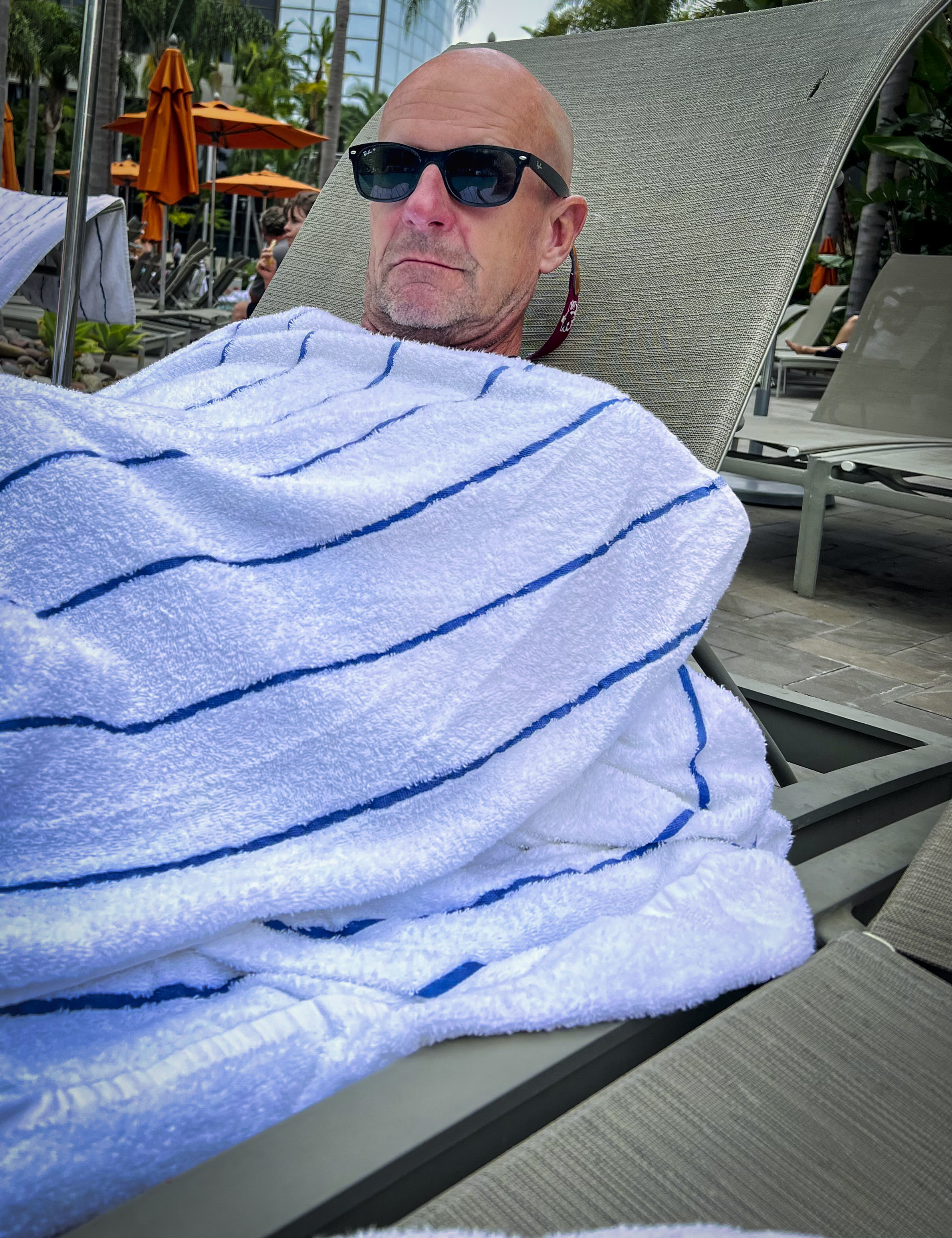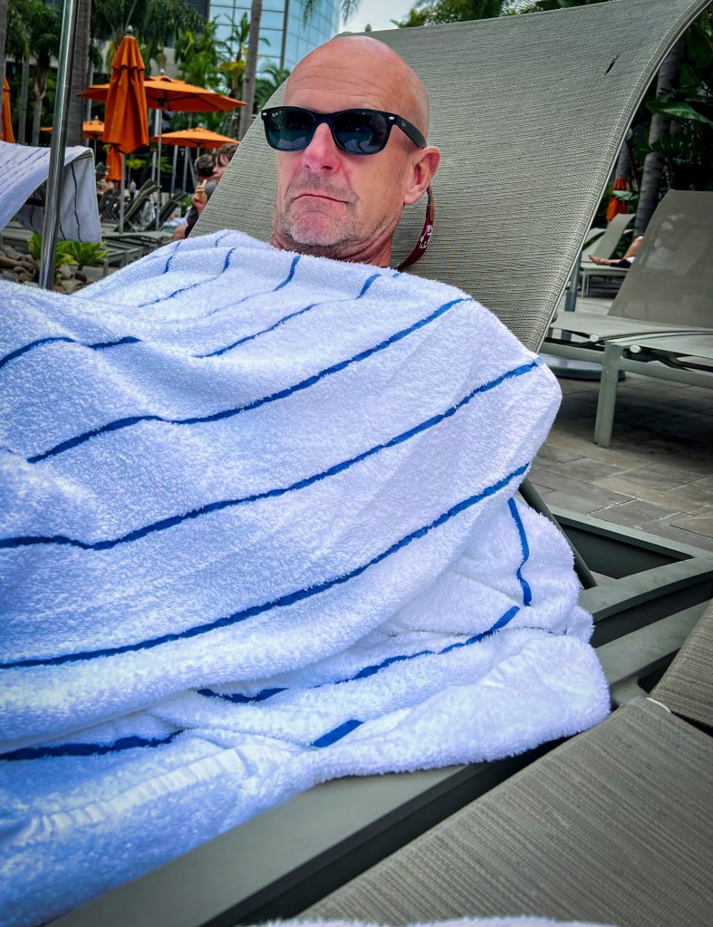 Strolling the waterfront in the evening was delightful. The weather in San Diego is just perfect, and the sunsets were lovely. Of course, we did have our moments by the pool where it got a little chilly. In those moments you could find us like this:
